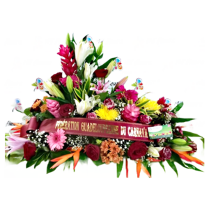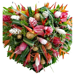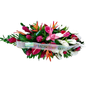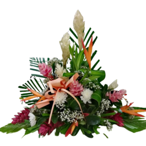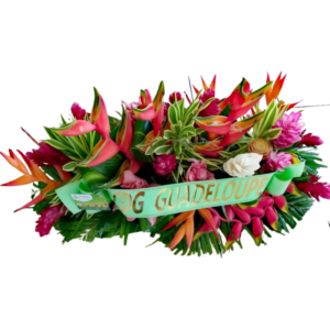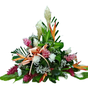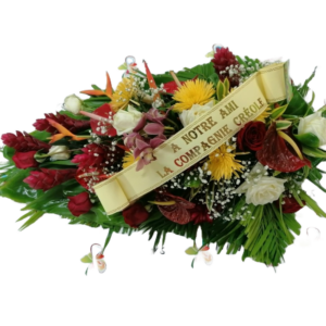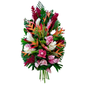 Raquette comprenant des fleurs tropicales; alpinias blancs, rouges et roses, héliconias, chrysanthèmes, gypsophile et feuillage divers.