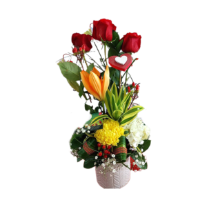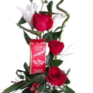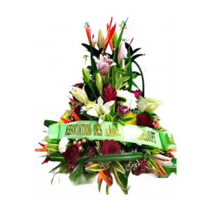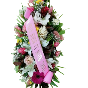 et de fleurs tempérées; lys, roses gros boutons, gerberas, chrysanthèmes variés, gypsophile et de feuillage varié.