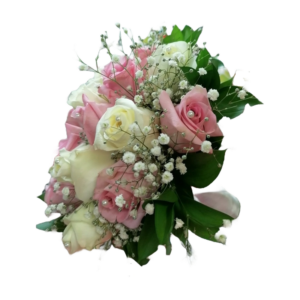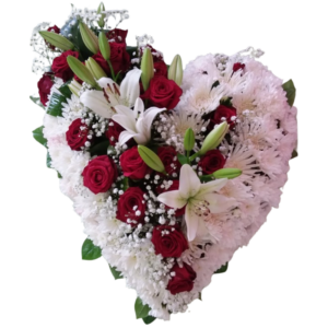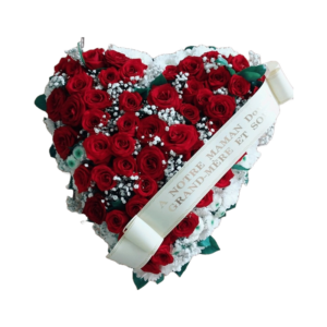 Composé de 50 roses rouges gros boutons, de nuage de gypsophile et d’une bordure de chrysanthèmes blancs.