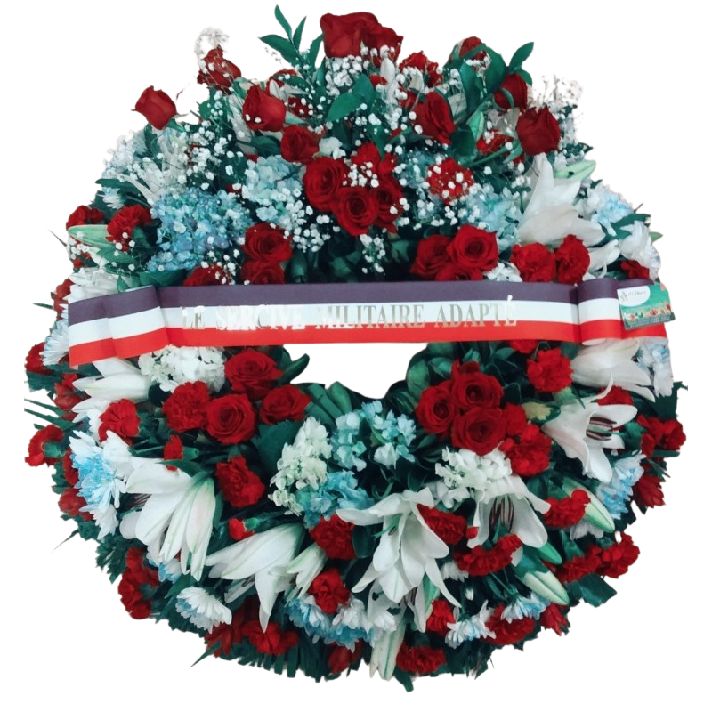 La fleur dominante est la rose, ici la rose rouge mais elle peut-être remplacée par une autre couleur, du lys, de la gypsophile, quelques fleurons de chrysnthèmes teintés bleus pour avoir les couleurs de la République.